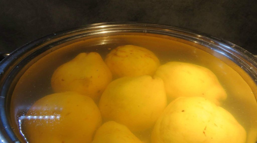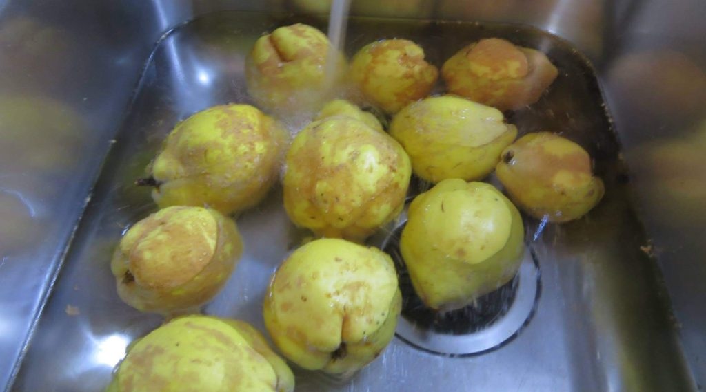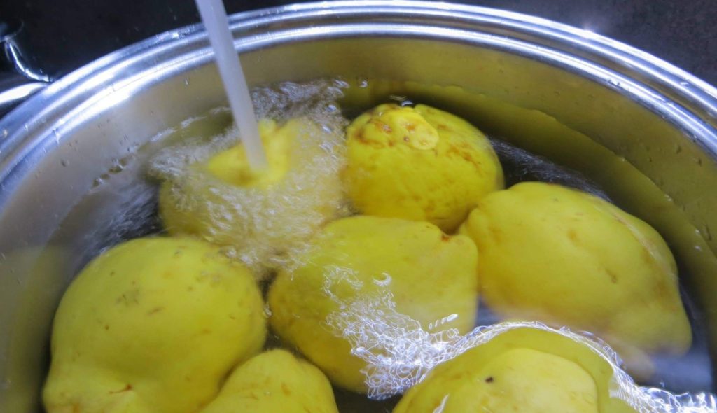 Para descascar rapidamente a pera-marmelo, visto que possui uma casca bastante resistente, há um modo simples: ferva as peras-marmelo por 10 minutos em água e suco de um limão.