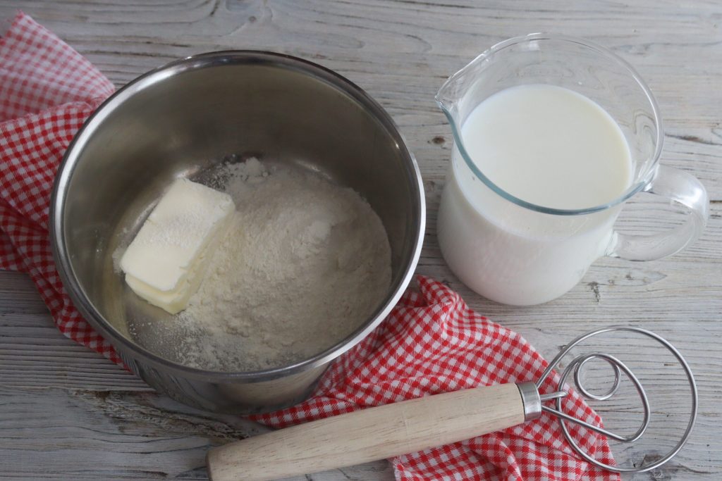 Preparo o bechamel colocando na panela a manteiga com a farinha e enquanto mexo e a manteiga derrete, adiciono aos poucos o leite morno.