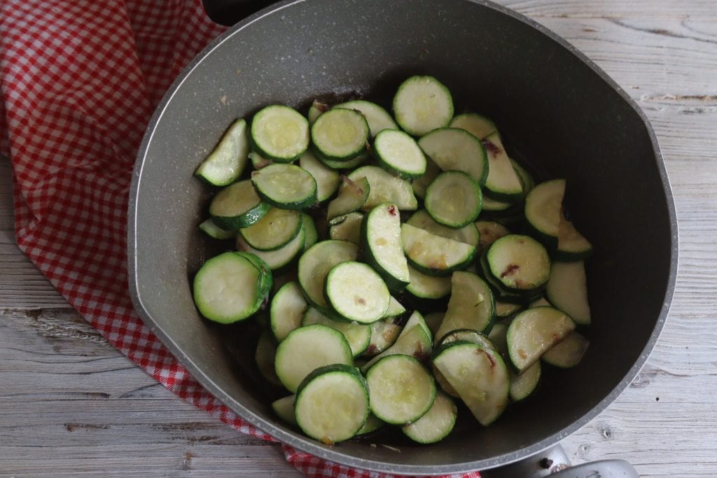 Adiciono as abobrinhas e deixo cozinhar por 5 minutos em fogo alto, devem ficar crocantes.