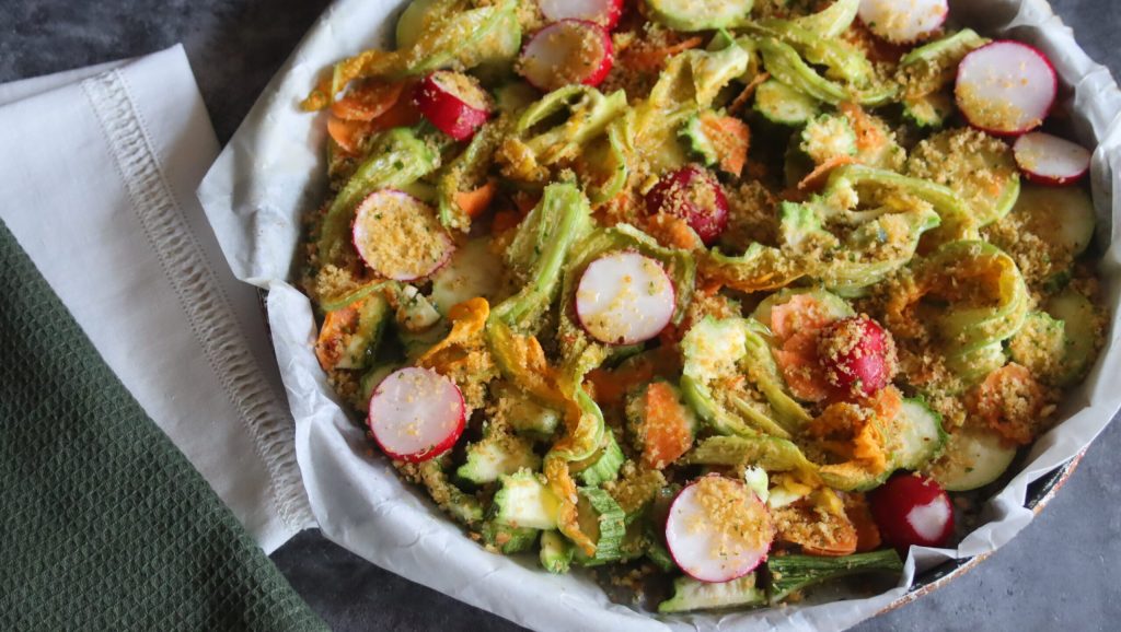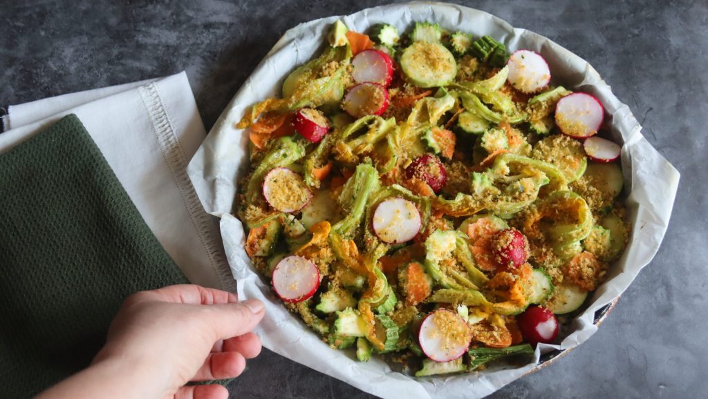 • Na forma com papel manteiga distribua os legumes cortados e cubra com a farinha de rosca aromatizada. Se necessário, adicione ainda um fio de azeite por cima e cozinhe no micro-ondas em modo Crisp por 20 minutos.