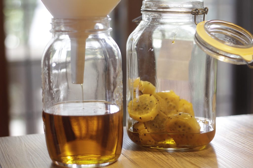 Após o tempo de descanso de 2 semanas, filtre com a ajuda de gaze e funil. Transfira para um pote com tampa hermética