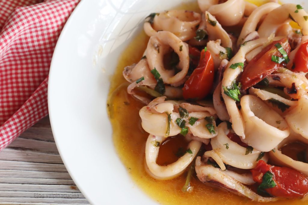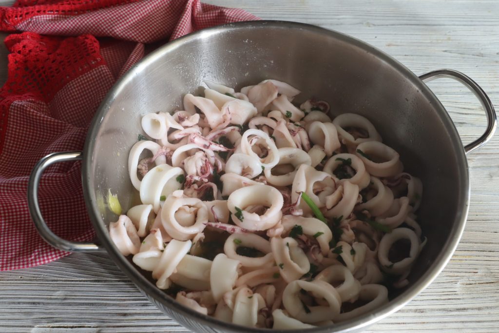 • Primeiro, na panela, coloco o alho com o azeite de oliva extra virgem, a salsa com uma raspa de limão. Se você gostar, também a pimenta: eu coloquei. Cortei as lulas e as adicionei ao óleo quente. Assim que secaram a água do cozimento, coloco o vinho branco e deixo evaporar. Faço tudo em 10 minutos.