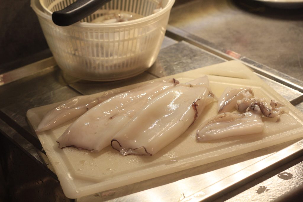 • Na frigideira coloque o alho, o azeite e os tentáculos das lulas cortados em pedaços. Frite.