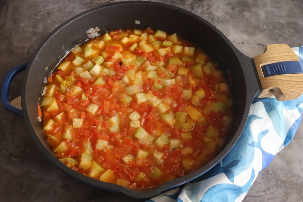 • Com o descascador, descasquei a abobrinha longa e depois cortei em pequenos pedaços com o cortador de legumes. Fiz o mesmo com as batatas. Na minha fantástica panela, a fabulosa Cookut, coloquei uma colher de óleo e a cebola picada finamente. Por cima, logo coloquei abobrinhas e batatas, uma leve dourada em tudo e acrescentei os tomates cortados sempre bem pequenos. Ajusto o sal e deixo cozinhar por 30 minutos.