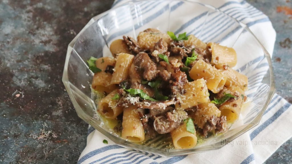 E aqui está, pronta a massa com cogumelos e linguiça.
