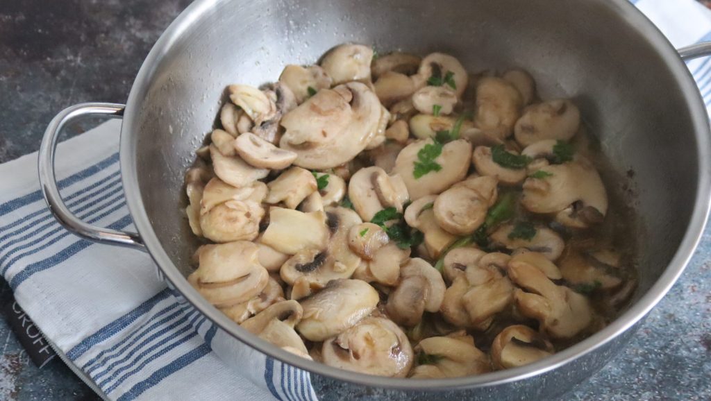 Doure o alho em uma frigideira com azeite de oliva extravirgem, adicione os cogumelos ao refogado (eu comprei aqueles em bandeja, já cortados e limpos), deixe dourar por 5 minutos e adicione a salsinha picada, salgue e continue cozinhando por mais 10 minutos.