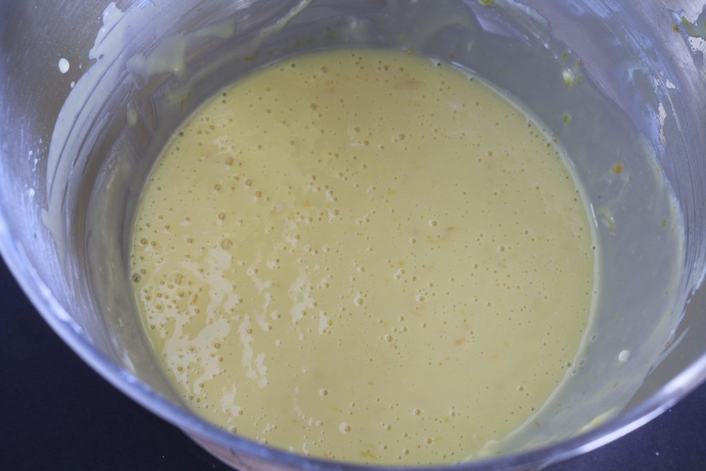 Na batedeira, coloque as gemas com o açúcar e as raspas da casca do limão e da laranja, bata até ficar espumoso.