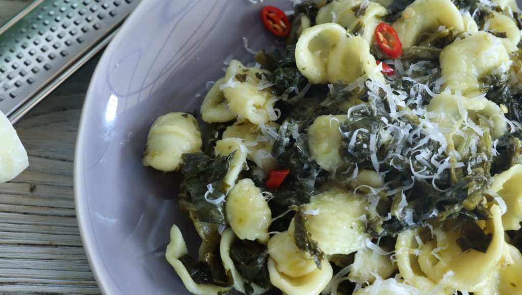Orecchiette com folhas de nabo, um prato principal típico da região da Puglia e, em particular, da tradição culinária da província de Bari. Um único vegetal, mas com muitos nomes: em Roma, são chamados de broccoletti, enquanto em Nápoles, friarielli, e na Toscana, rapini. A rapa é um vegetal da mesma família da couve-flor, da couve e da couve de Bruxelas; a rapa, portanto, é a raiz das folhas de nabo, ou seja, as folhas que a representam. Preparar orecchiette em casa não é tão difícil, com a prática, gradualmente, adquire-se habilidade. Geralmente, são feitas com farinha de trigo duro e farinha branca, uma pitada de sal e água adicionada aos poucos. Ainda hoje, em quase todas as casas de Bari, orecchiette são feitas à mão
