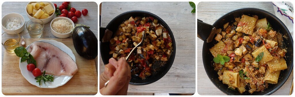 Douramos o peixe-espada na frigideira com alho, salsa e hortelã, e quando estiver dourado, deglace com conhaque. Em outra panela, faça um molho com cebola e tomate, cozinhe por dez minutos e, quando pronto, adicione o peixe-espada dourado. À parte, frite as berinjelas e, quando estiverem cozidas, após secá-las com papel absorvente, adicione-as ao molho. Toste o pão ralado com uma colher de chá de azeite em uma frigideira. Cozinhe os paccheri al dente e termine de cozinhar na frigideira com o molho de peixe-espada e berinjela. Antes de servir, polvilhe com o pão ralado tostado.