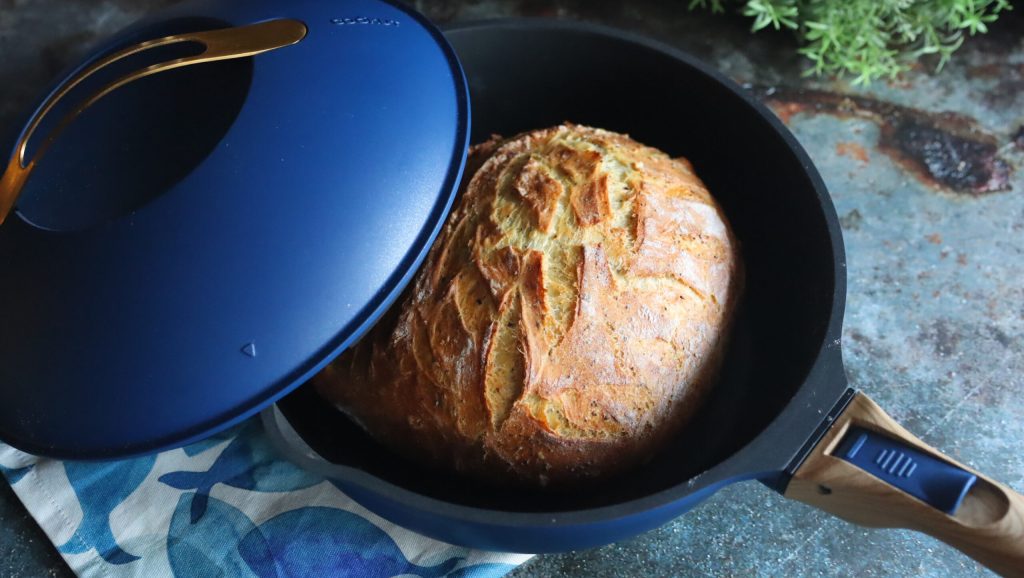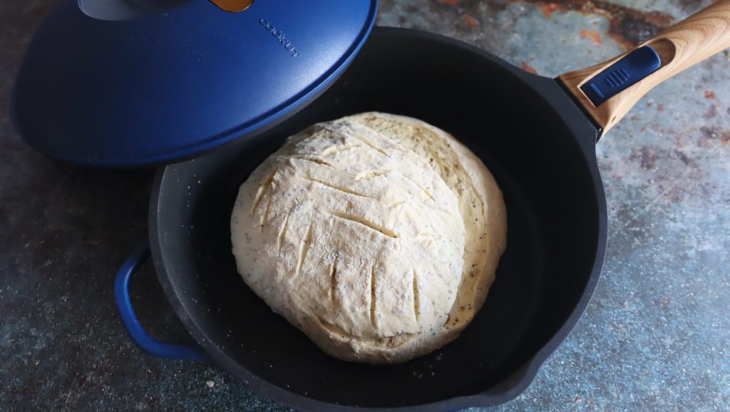 Ligo o forno a 225°C e coloco minha panela Cookut para aquecer (sem a alça obviamente, muito conveniente porque é removível). Retiro a panela do forno e coloco o pão fermentado. Com o cortador apropriado, faço vários cortes de decoração, cubro com a tampa e, ajudando-me com a alça, levo ao forno por 30 minutos.
