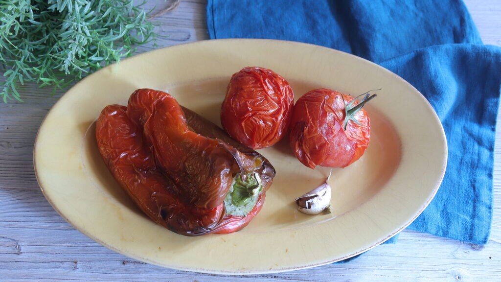 Descasquei os tomates, descasquei o alho e limpei o pimentão da pele e das sementes.