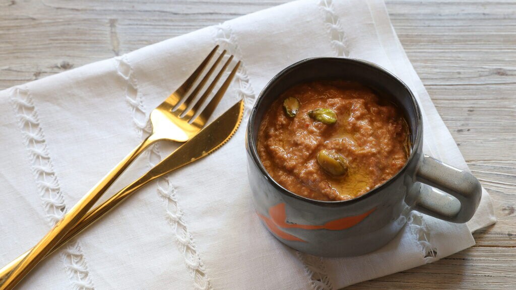 No picador, coloquei os tomates, os pimentões, o alho, o pão, o óleo, o sal, as nozes e os pistaches.
