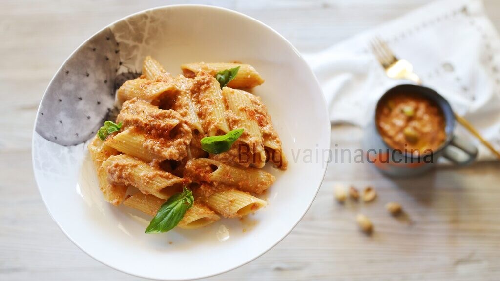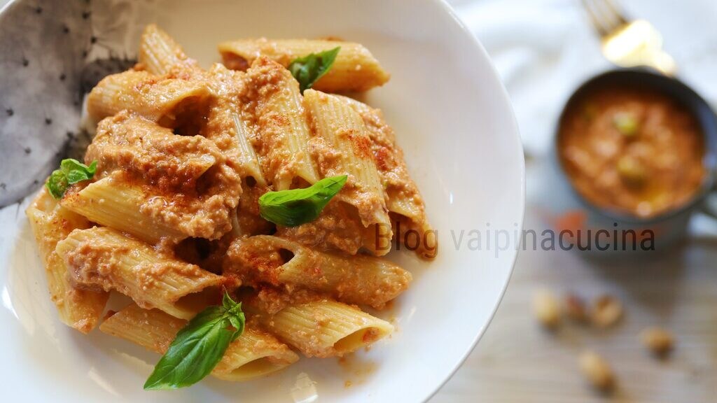 Penne com molho Romesco, uma boa alternativa realmente simples para temperar a massa. Alguns dias atrás, eu cozinhei este molho extraordinário e preparei algumas bruschettas excepcionais, com a fritadeira sem óleo rapidamente se fazem milagres na cozinha. Congelei uma parte do molho Romesco para verificar pessoalmente se uma vez descongelado ainda seria bom e hoje posso assegurar que o resultado é ótimo, da mesma forma também guardo o pesto de manjericão ou o de tomate pantesco, já em porções prontas para uso uma vez descongeladas.