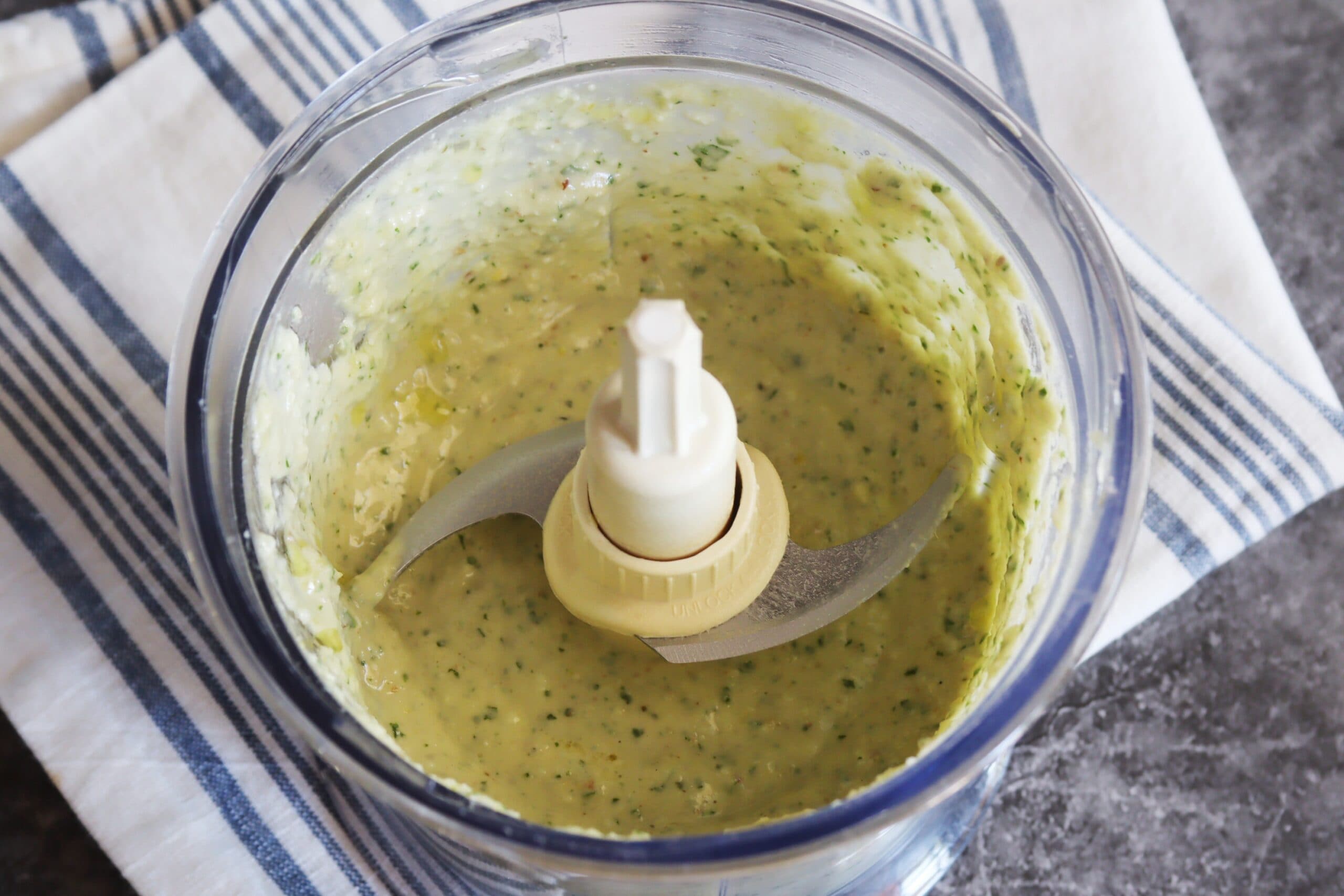 Intermitentemente, triturei todos os ingredientes e, somente quando estavam bem misturados, coloquei o pesto em um pote e o conservei na geladeira até o momento de usar.