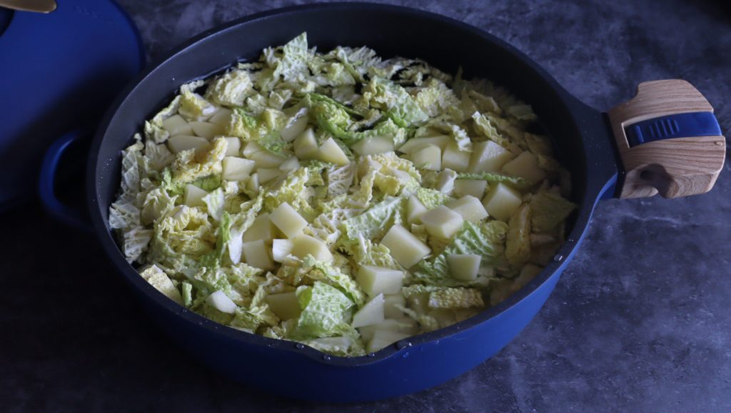 Lave e corte a couve em fatias finas, faça o mesmo com as batatas. Coloque a panela Cookut no fogo com água e sal. Assim que a água ferver, coloque as batatas e a couve, tampe e ajuste o timer para 10 minutos.