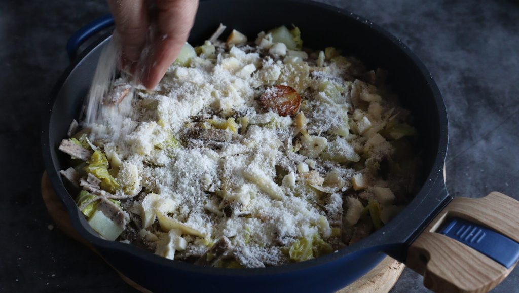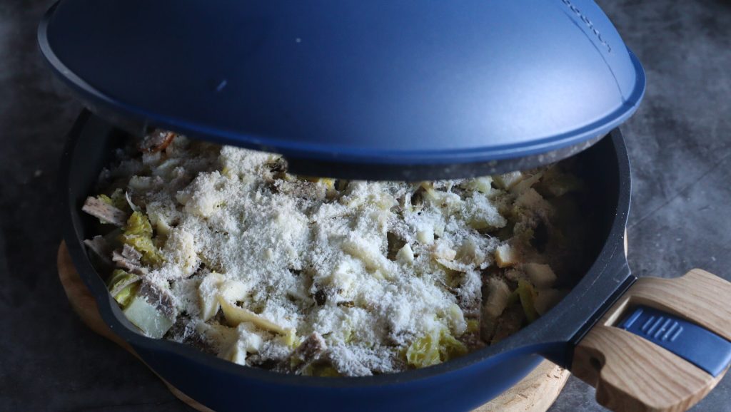 Coloque na panela Cookut uma camada de batatas e couve, uma porção de queijo bitto cortado em pedaços pequenos e o parmesão.