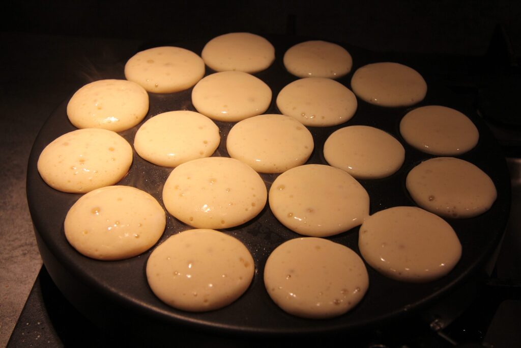 Aqueça a poffertjespan, (alternativamente, uma chapa de ferro fundido ou frigideira antiaderente funciona também) com um biberão para caldas despeje uma quantidade de massa que não ultrapasse a borda.