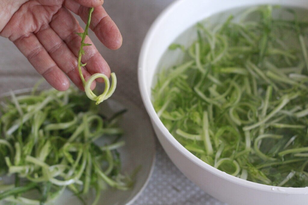 Coloque imediatamente em água fria que, além de perder o amargor, verá que se formarão cachos.