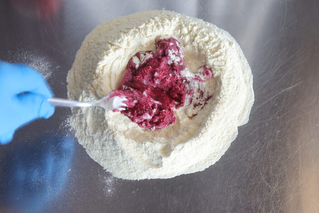 comece a misturar e incorporar os dois ingredientes delicadamente com o garfo. O recheio dos raviolis geralmente já é bastante substancioso, então não adiciono ovos na massa vermelha, talvez um pouco de água se necessário.