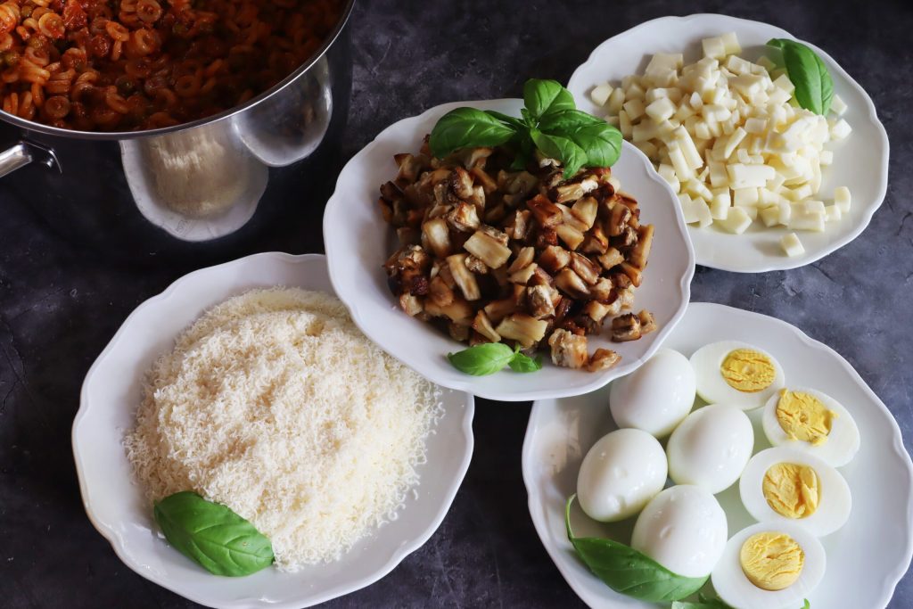 Cozinho os anelletti por 5 minutos e resfrio-os em água fria para interromper o cozimento, preparo o parmesão ralado e corto o caciocavallo em pedaços pequenos.