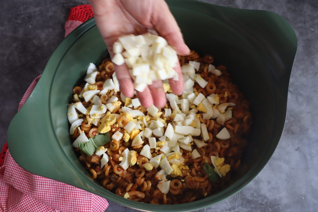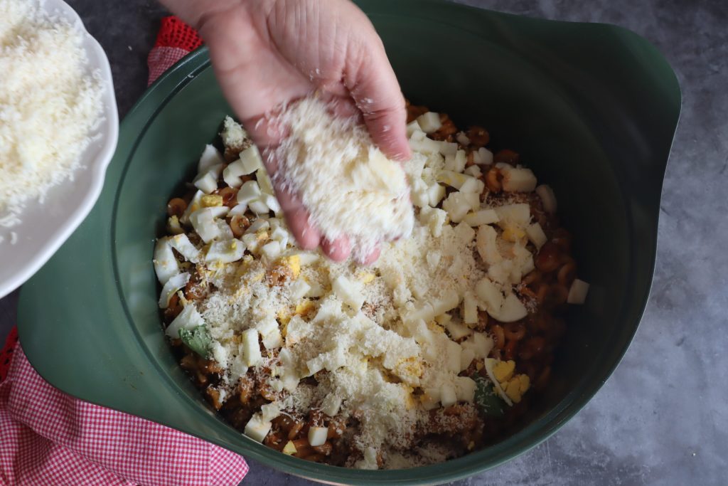 • Primeiro tempero os anelletti com o molho de carne. Sem sujar outras tigelas, faço isso na panela em que fervi a massa. Deixo uma xícara de molho para a última camada.