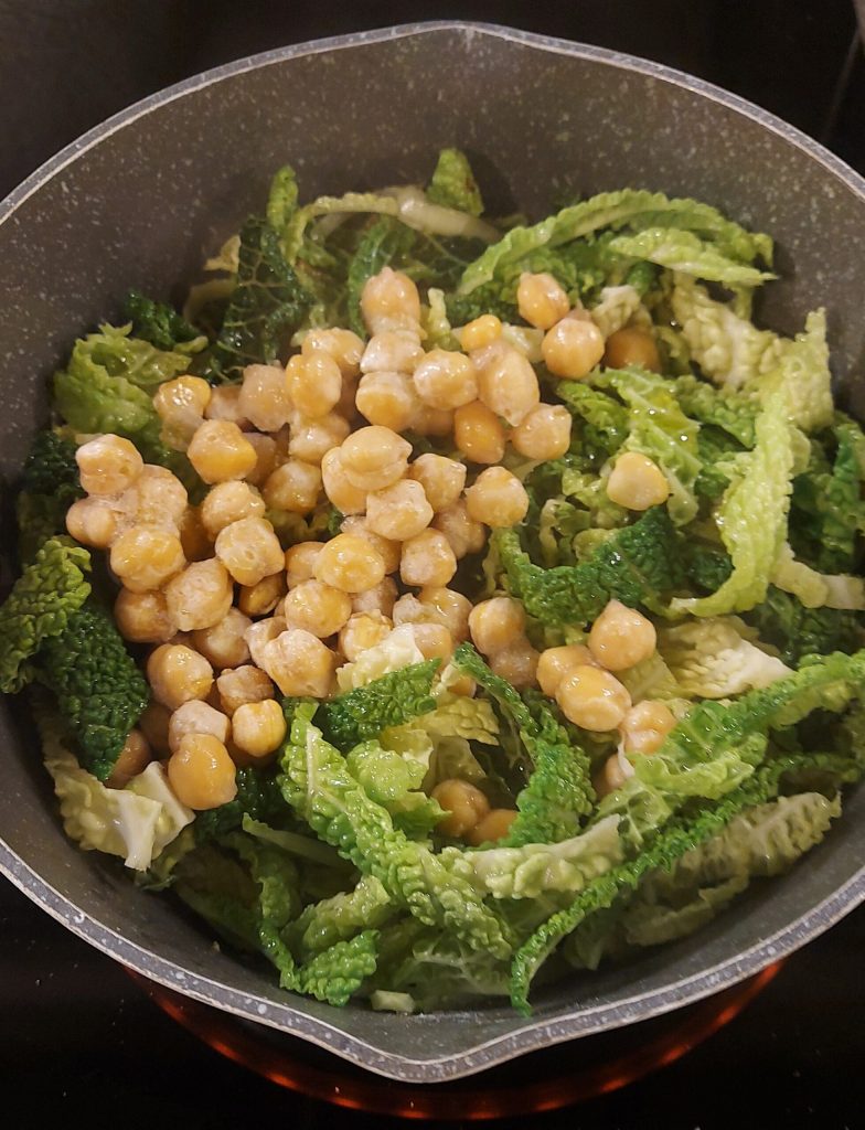 • Na panela, coloquei o azeite com o alho-poró cortado em fatias finas e um pedaço de pimenta vermelha picante. Em seguida, coloquei o repolho savoy e deixei dourar levemente, mexendo frequentemente por 10 minutos em fogo alto. Salguei o repolho e adicionei um copo de água. Com a tampa e em fogo baixo, deixei cozinhar por 20 minutos. Removi a tampa e adicionei o grão-de-bico escorrido da água de conservação, continuando o cozimento por mais 10 minutos.