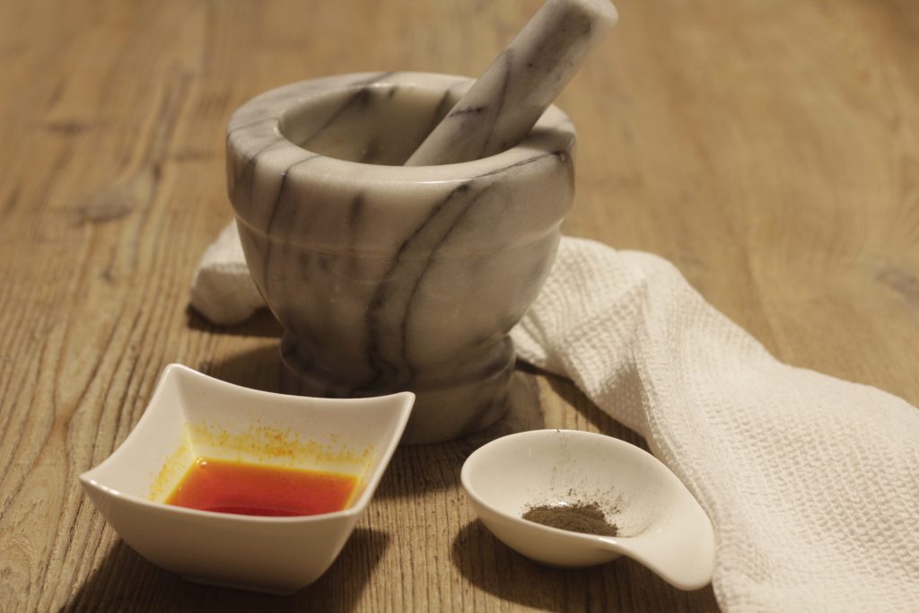 Use o pilão para reduzir a pó os pistilos de açafrão e logo após limpá-lo com um pano seco, amasse da mesma forma o alcaçuz nele.