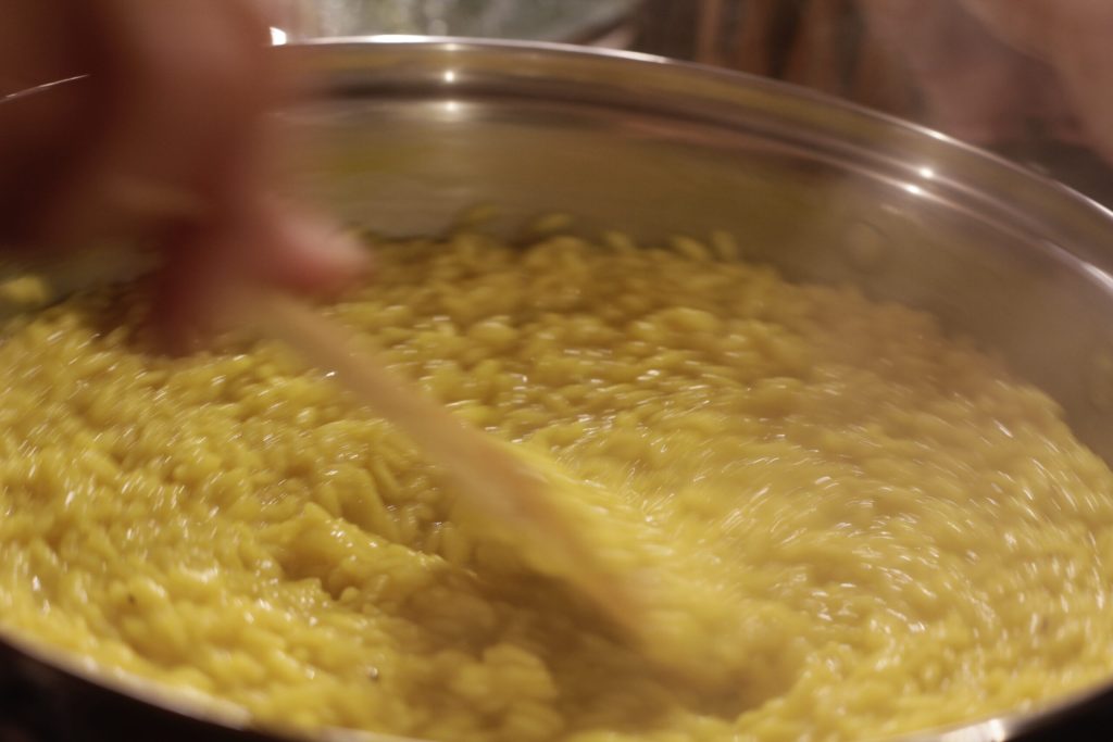 Junto com a primeira concha de caldo fervente, adicione também aquela com o açafrão. Mexa continuamente e, se necessário, regue o risoto com o caldo para evitar que seque.