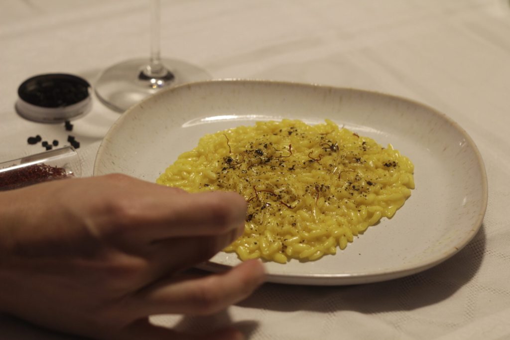 Bastará uma noz de manteiga ao término do cozimento, cerca de 18 minutos, uma pitada de pimenta preta moída na hora e um pouco de parmesão para finalizar o risoto de açafrão e alcaçuz com o fogo desligado.