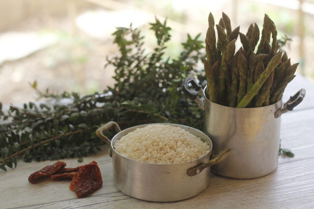 Risoto de aspargos e tomates secos, o suficiente para dar aquele sabor a mais que faz a diferença! Últimos tomates secos da temporada passada, a partir de agora esperamos os da próxima preparação em agosto, quando os tomates estão no auge da sazonalidade. Quanto aos aspargos, todos sabemos que este é o período de colheita. Este legume possui propriedades diuréticas, pois estimula diretamente os rins, e é por isso que não se deve consumir em grandes quantidades habitualmente para quem sofre disso, pois tem efeito irritante para os rins. Mas infelizmente a sazonalidade dos aspargos é tão curta que, felizmente, não se torna um grande problema. Assim, hoje vamos preparar um belo risoto de aspargos e tomates secos. Além desses dados técnicos que são facilmente encontrados em livros, eu mesma obtive após várias pesquisas e posso acrescentar que os aspargos são realmente bons e versáteis na cozinha.