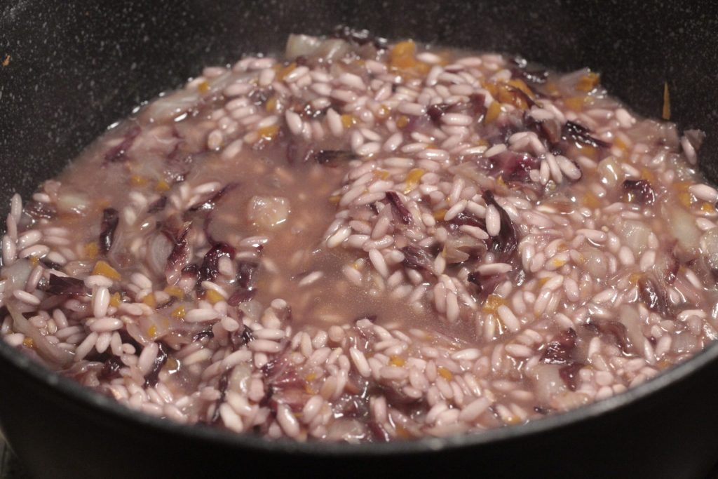 Preparação do risoto de radicchio e gorgonzola
