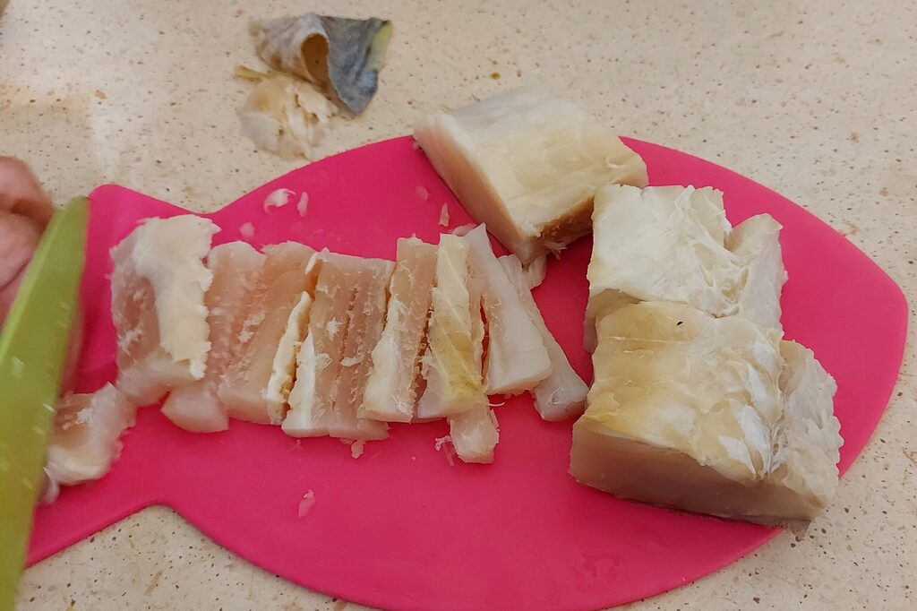 Quanto menores forem os pedaços de bacalhau seco melhores serão quando você misturar e temperar tudo junto para preparar a salada de bacalhau seco.