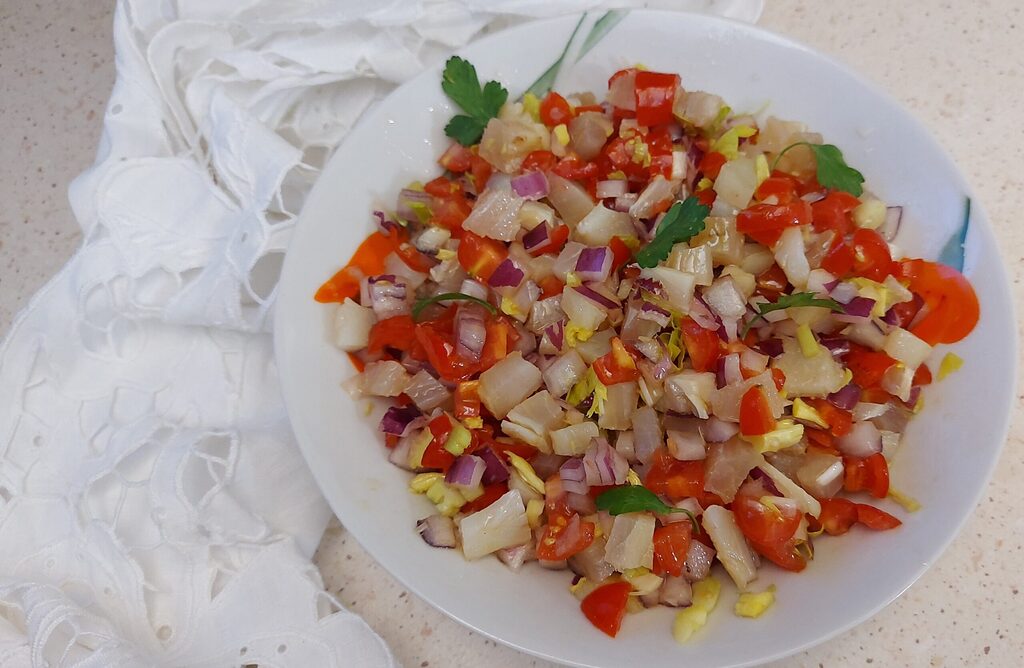 Misture bem e finalize com uma pitada de salsinha picada. Aqui está pronta a salada de bacalhau seco