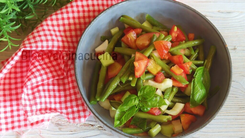 Salada de vagem cozida e como evitar que fiquem escuras durante o cozimento, junto com aipo fresco e tomatinhos da Apúlia, uma verdadeira delícia. Começam em maio e terminam em setembro as vagens no mercado, pelo menos falando da sazonalidade, porque hoje todos podemos ver que o mercado oferece tudo em todas as estações. As vagens são leguminosas da primavera com vagem ricas em sais minerais e vitaminas, ideais para um acompanhamento fresco e primaveril, mas também quente para o outono, ainda podem ser encontradas nas barracas dos mercados regionais e na grande distribuição.