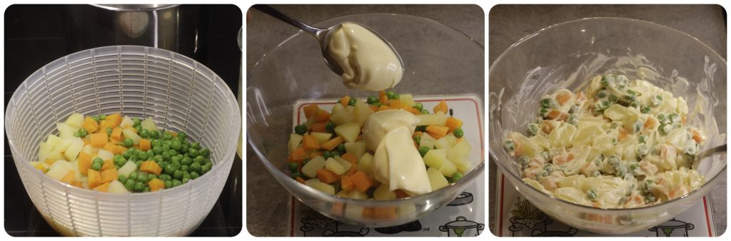 Não ultrapasse o tempo de cozimento, cinco minutos são realmente suficientes. Como já mencionado acima, não jogue fora a água do cozimento, mas use-a para outras preparações. Escorra bem as batatas, as cenouras e as ervilhas e deixe esfriar em temperatura ambiente.