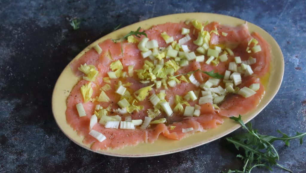 Existem dois métodos de defumação dos salmones. Um é chamado de “a quente” e consiste em defumar o salmão a uma temperatura em torno de 60°C, cozinhando-o em poucas horas e, na última fase, interrompendo a ventilação, cobrindo o salmão com lascas úmidas. Esse método é usado principalmente para peixes frescos, que podem ser conservados por até 8 dias. Já o procedimento chamado de “a frio” consiste em salgar o salmão, deixá-lo secar por alguns dias e depois passar à defumação em torno de 20°C por vários dias. Com esse método, o salmão defumado a frio se mantém por mais tempo, até 15 dias. Aqui está um prato que faço frequentemente.