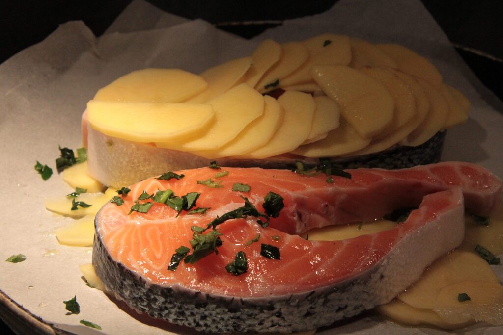 Salmão em crosta de batatas, prato simples e completo. Acrescento também saudável, porque o salmão contém propriedades nutritivas importantes para a saúde, como os ômega 3. O salmão é um peixe rico em potássio, magnésio e fósforo em maior quantidade, mas não esqueçamos que contém também muitas outras vitaminas, além de combater os radicais livres. Existem várias maneiras de cozinhá-lo, você pode experimentar outras receitas no meu blog.giallozafferano.it/vaipinacucina, como a salada de salmão e romã, ou a cream tart salgada de salmão.