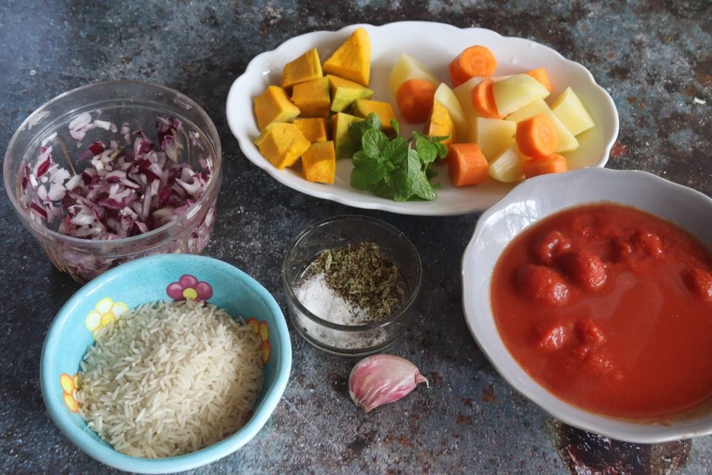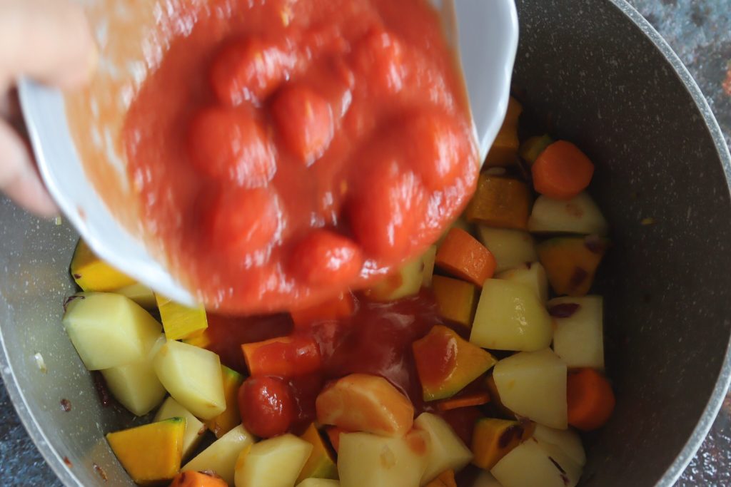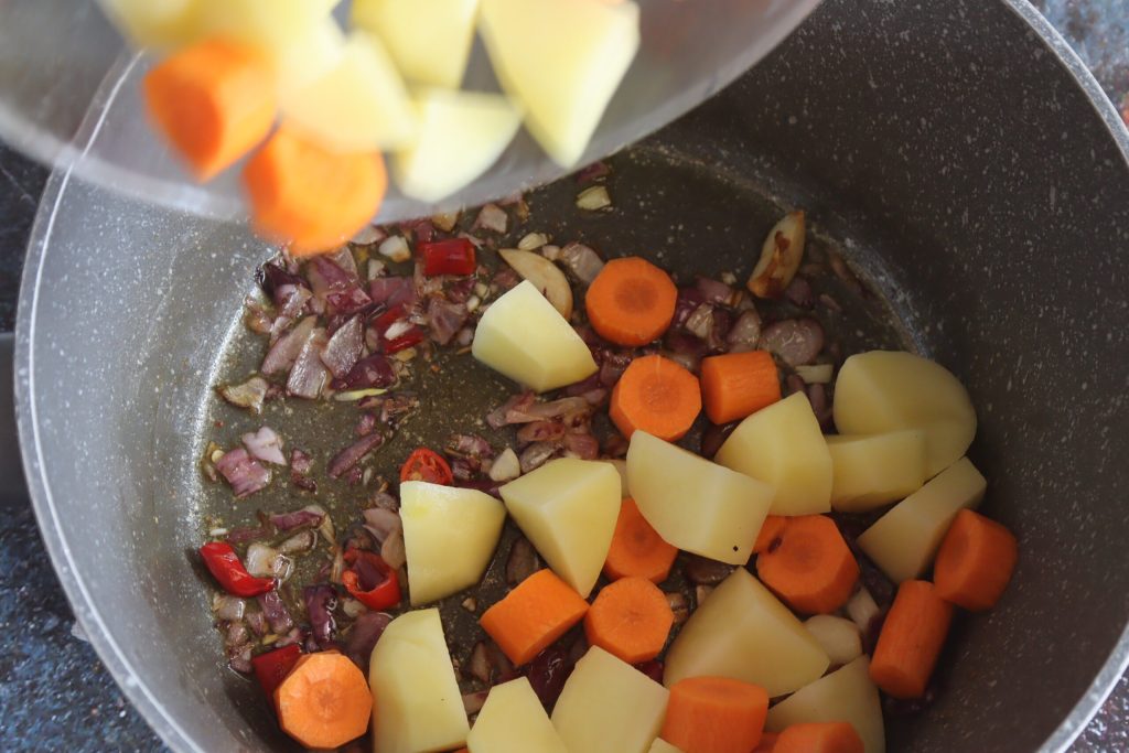 • Panela com azeite no fogo, adicione a cebola picada com o alho, a pimenta malagueta e deixe dourar. Adicione as batatas, as cenouras e a abóbora cortada em cubos, deixe dourar por alguns segundos e coloque também o tomate. Cubra com caldo de legumes ou simplesmente com água morna, ajuste o sal e deixe cozinhar por 15 minutos.