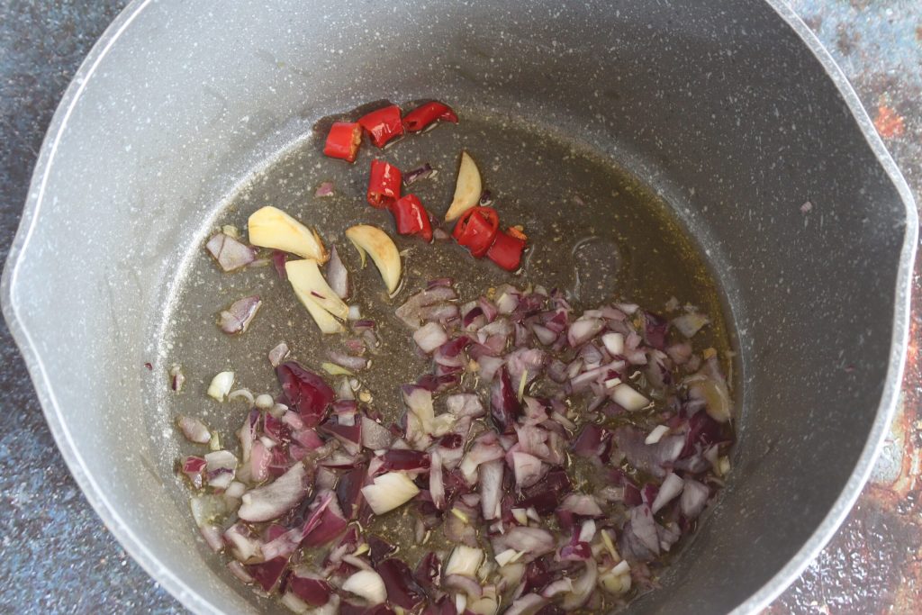 • Na caçarola, coloque o azeite com o alho, a cebola picada finamente e a pimenta malagueta, de preferência fresca.