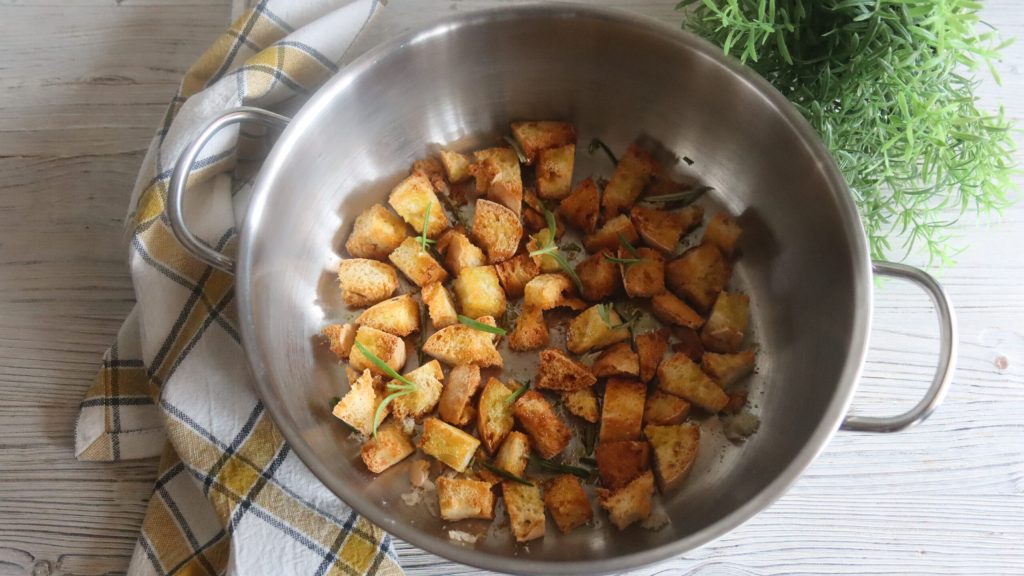 Cortei em fatias e depois em quadradinhos o pão sem sal, coloquei na frigideira com ramos de alecrim e 2 colheres de sopa de azeite até dourar de todos os lados.