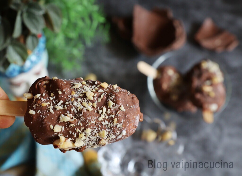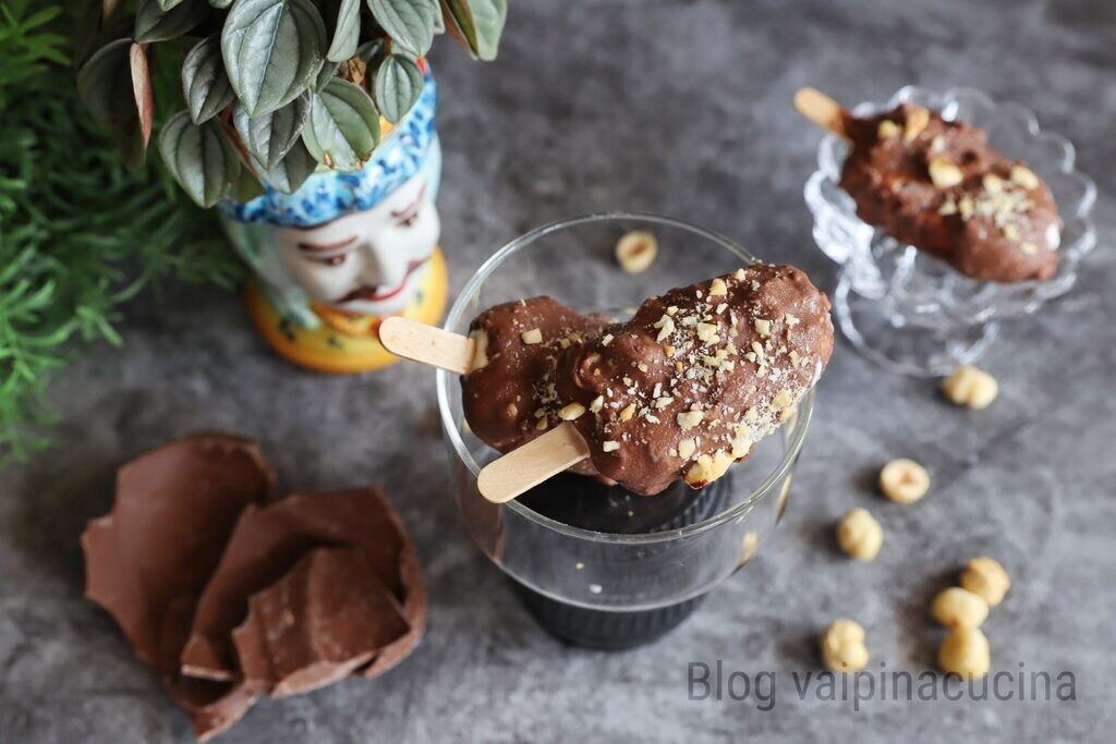 Em um copo, passe o chocolate derretido e um par de colheres de chá de avelãs trituradas, retire o sorvete do recipiente de silicone e introduza-o, já frio após as 4 horas no congelador, no copo com o chocolate quente e as avelãs trituradas, retire-o imediatamente e coloque-o de volta no congelador. E aqui está o sorvete no palito pronto para ser saboreado a qualquer momento do dia por adultos e crianças.