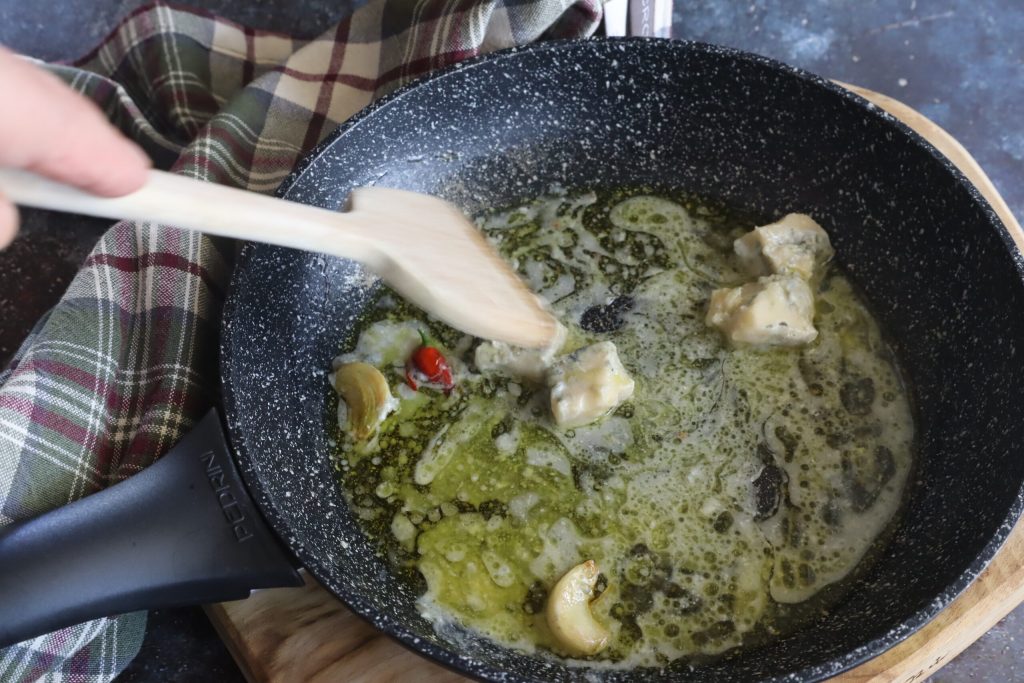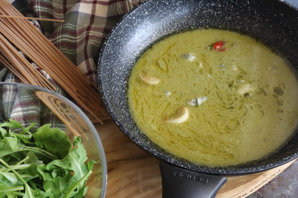 • Na frigideira, com duas colheres de azeite, doure o alho com a pimenta calabresa.