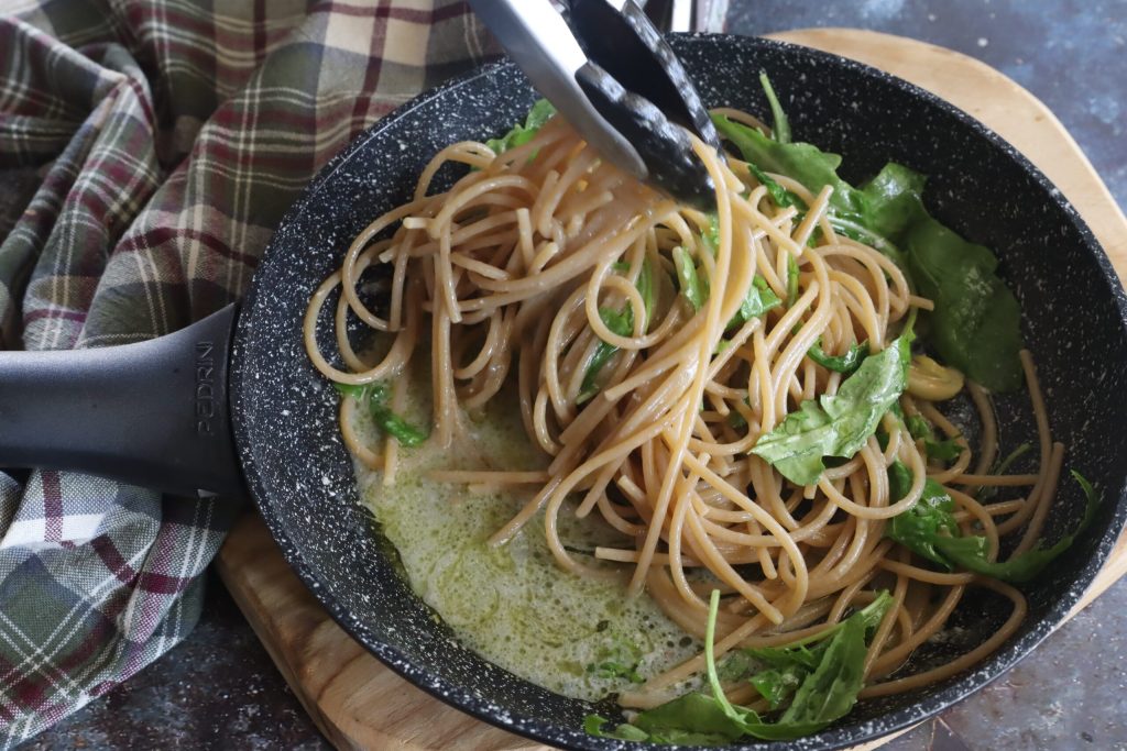 • E aqui estão eles, prontos e perfumados, os spaghetti rúcula e gorgonzola.
