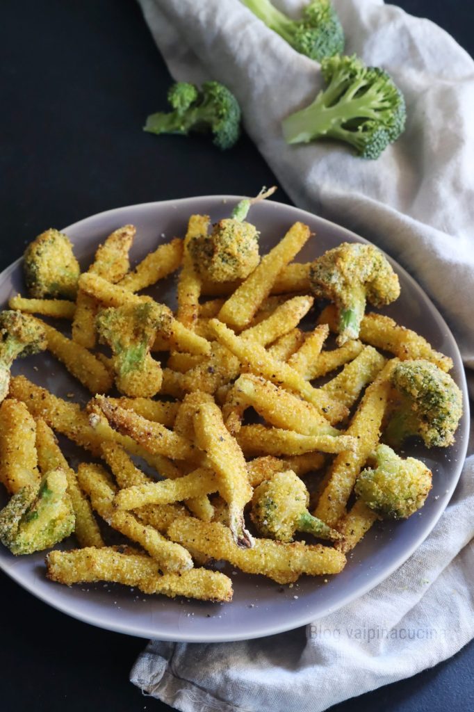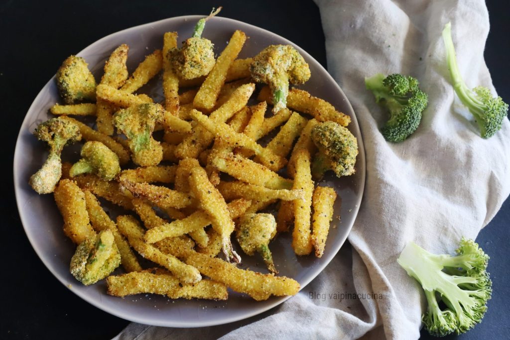E aqui estão eles prontos e crocantíssimos: os talos de brócolis empanados, veganos, sem lactose e sem glúten.