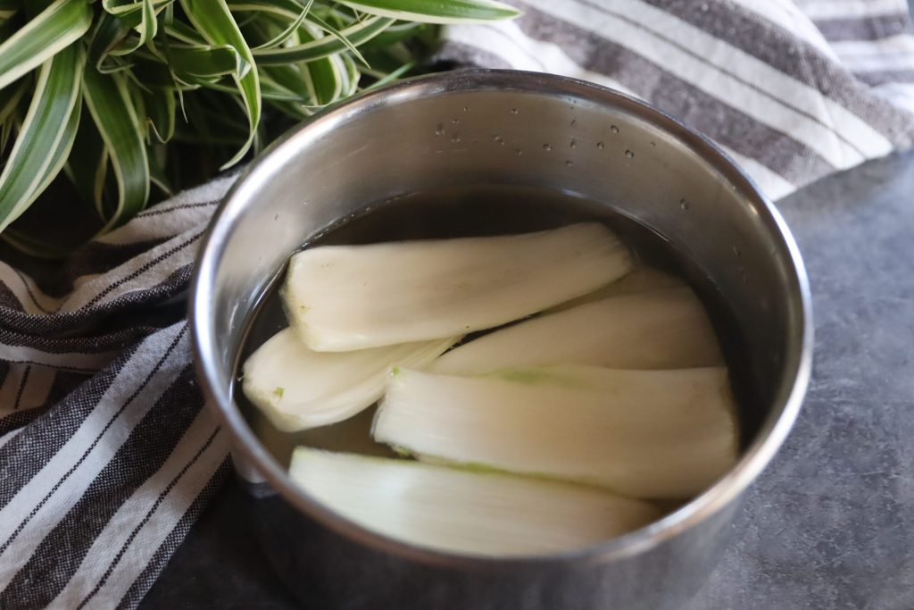 Em água fria coloco os talos de acelga e os faço ferver por 10 minutos.