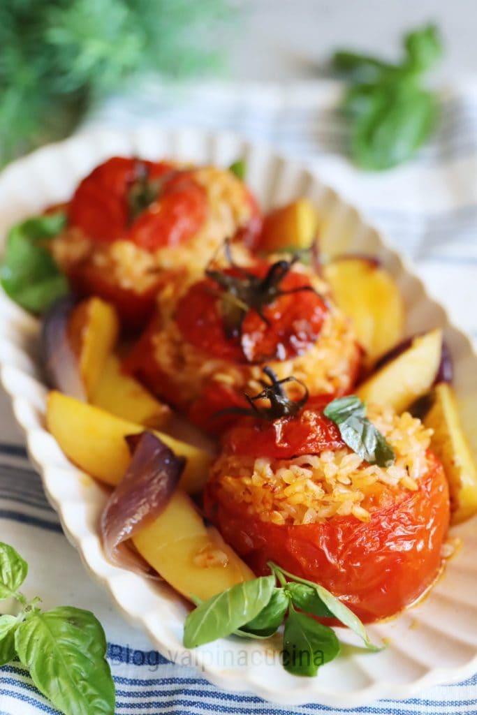 Lave os tomates sem remover o talo, corte a tampinha superior para abri-los e com a ajuda de uma colher retire a polpa. Triture a polpa com o passador de legumes sem desperdiçar a água que se formou. Tempere os tomates com sal e vire-os de cabeça para baixo para escorrer. Na polpa do tomate triturada, adicione o arroz com o alho picado, o sal com o azeite e bastante manjericão picado, muito manjericão. Deixe marinando por um bom tempo antes de rechear os tomates e enquanto isso, lave as batatas e corte-as em pedaços, (eu não descasquei, mas, se preferir, pode descascar), limpe e corte em fatias grossas também as cebolas e coloque tudo na assadeira, incluindo a água dos tomates que você retirou no início.