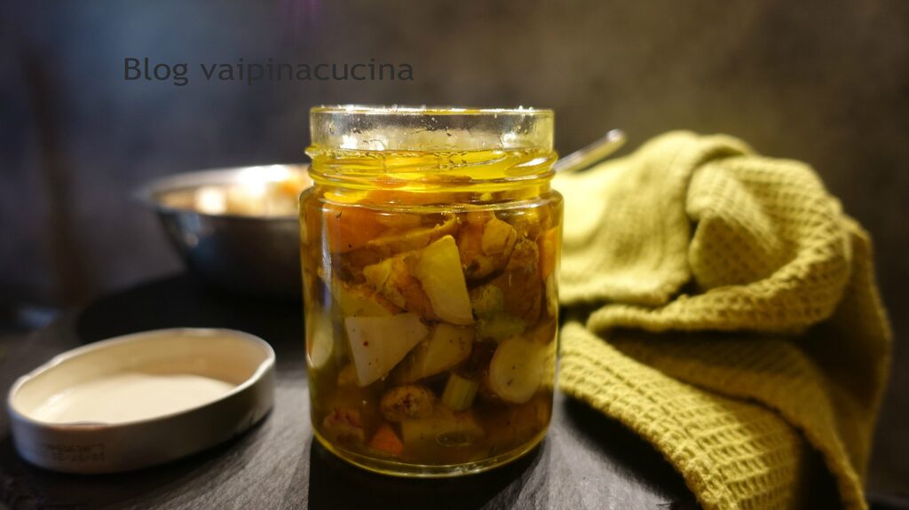 Topinambur em conserva de óleo, já conhecemos todas ou quase todas as propriedades benéficas do topinambur, para quem está descobrindo agora este maravilhoso tubérculo, recomendo a leitura no meu blog.giallozafferano.it/vaipinacucina para obter informações sobre o tubérculo na receita de risoto de topinambur. É sabido que todos os vegetais podem ser preparados em conserva de óleo, mas o topinambur em conserva de óleo para mim foi uma verdadeira surpresa, delicioso, não acredito que chegaremos a consumi-lo no Natal com todos os aperitivos, é muito bom para esperar. Acompanha simples e rápido de preparar em conserva de óleo é muito saboroso. Com uma breve pesquisa na internet descobri que o topinambur contém pouco níquel, então está liberado para quem, como eu, tem essa intolerância! Mas não exagere, não disse que não tem!