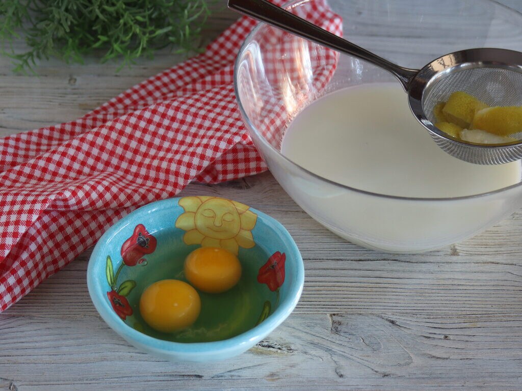 Para preparar o creme, em uma panela aqueço o leite com o açúcar e as cascas de limão.