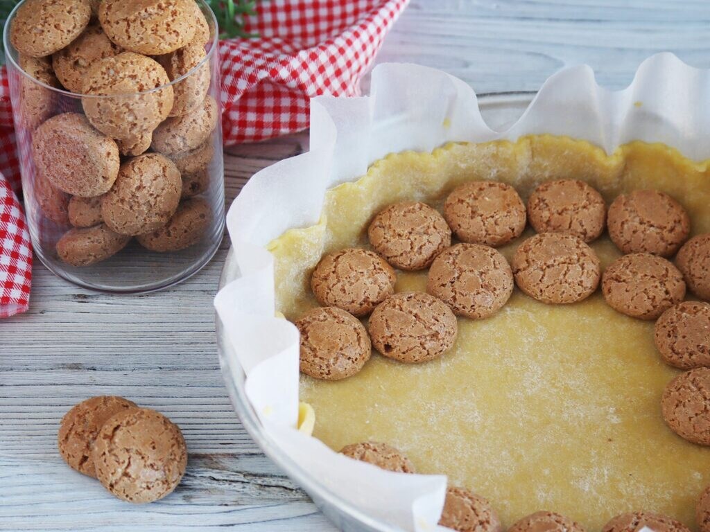 Retomo a massa e a estico diretamente sobre o papel manteiga e coloco imediatamente na forma, disponho os amarettos em círculo sobre a massa com uma leve pressão.
