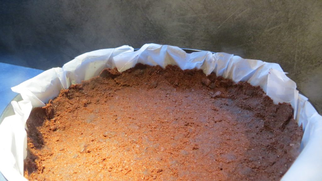 • Em uma forma com papel manteiga, distribua a mistura de biscoitos e manteiga, subindo nas laterais para formar uma crosta.